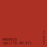 Цвет #AD3025 в цветовой модели RGB обозначается тремя октетами (173, 48, 37) в десятичном формате и #AD3025 в шестнадцатиричном (hex) формате, которые являются интенсивностью красного 173 (hex AD), интенсивность зелёного 48 (hex 30) и интенсивность синего 37 (hex 25).