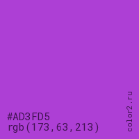 Цвет #AD3FD5 в цветовой модели RGB обозначается тремя октетами (173, 63, 213) в десятичном формате и #AD3FD5 в шестнадцатиричном (hex) формате, которые являются интенсивностью красного 173 (hex AD), интенсивность зелёного 63 (hex 3F) и интенсивность синего 213 (hex D5).
