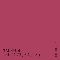 Цвет #AD405F в цветовой модели RGB обозначается тремя октетами (173, 64, 95) в десятичном формате и #AD405F в шестнадцатиричном (hex) формате, которые являются интенсивностью красного 173 (hex AD), интенсивность зелёного 64 (hex 40) и интенсивность синего 95 (hex 5F).