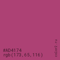 Цвет #AD4174 в цветовой модели RGB обозначается тремя октетами (173, 65, 116) в десятичном формате и #AD4174 в шестнадцатиричном (hex) формате, которые являются интенсивностью красного 173 (hex AD), интенсивность зелёного 65 (hex 41) и интенсивность синего 116 (hex 74).
