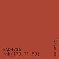 Цвет #AD4735 в цветовой модели RGB обозначается тремя октетами (173, 71, 53) в десятичном формате и #AD4735 в шестнадцатиричном (hex) формате, которые являются интенсивностью красного 173 (hex AD), интенсивность зелёного 71 (hex 47) и интенсивность синего 53 (hex 35).