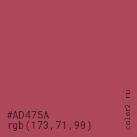 Цвет #AD475A в цветовой модели RGB обозначается тремя октетами (173, 71, 90) в десятичном формате и #AD475A в шестнадцатиричном (hex) формате, которые являются интенсивностью красного 173 (hex AD), интенсивность зелёного 71 (hex 47) и интенсивность синего 90 (hex 5A).