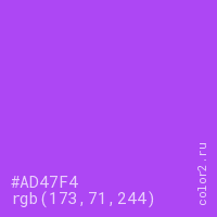Цвет #AD47F4 в цветовой модели RGB обозначается тремя октетами (173, 71, 244) в десятичном формате и #AD47F4 в шестнадцатиричном (hex) формате, которые являются интенсивностью красного 173 (hex AD), интенсивность зелёного 71 (hex 47) и интенсивность синего 244 (hex F4).