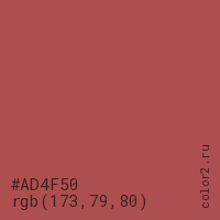 Цвет #AD4F50 в цветовой модели RGB обозначается тремя октетами (173, 79, 80) в десятичном формате и #AD4F50 в шестнадцатиричном (hex) формате, которые являются интенсивностью красного 173 (hex AD), интенсивность зелёного 79 (hex 4F) и интенсивность синего 80 (hex 50).