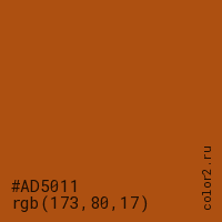 Цвет #AD5011 в цветовой модели RGB обозначается тремя октетами (173, 80, 17) в десятичном формате и #AD5011 в шестнадцатиричном (hex) формате, которые являются интенсивностью красного 173 (hex AD), интенсивность зелёного 80 (hex 50) и интенсивность синего 17 (hex 11).
