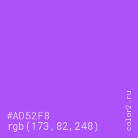 Цвет #AD52F8 в цветовой модели RGB обозначается тремя октетами (173, 82, 248) в десятичном формате и #AD52F8 в шестнадцатиричном (hex) формате, которые являются интенсивностью красного 173 (hex AD), интенсивность зелёного 82 (hex 52) и интенсивность синего 248 (hex F8).