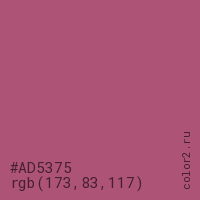Цвет #AD5375 в цветовой модели RGB обозначается тремя октетами (173, 83, 117) в десятичном формате и #AD5375 в шестнадцатиричном (hex) формате, которые являются интенсивностью красного 173 (hex AD), интенсивность зелёного 83 (hex 53) и интенсивность синего 117 (hex 75).