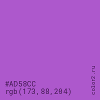 Цвет #AD58CC в цветовой модели RGB обозначается тремя октетами (173, 88, 204) в десятичном формате и #AD58CC в шестнадцатиричном (hex) формате, которые являются интенсивностью красного 173 (hex AD), интенсивность зелёного 88 (hex 58) и интенсивность синего 204 (hex CC).