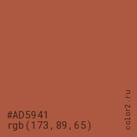 Цвет #AD5941 в цветовой модели RGB обозначается тремя октетами (173, 89, 65) в десятичном формате и #AD5941 в шестнадцатиричном (hex) формате, которые являются интенсивностью красного 173 (hex AD), интенсивность зелёного 89 (hex 59) и интенсивность синего 65 (hex 41).