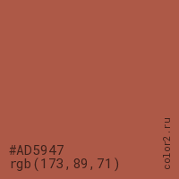 Цвет #AD5947 в цветовой модели RGB обозначается тремя октетами (173, 89, 71) в десятичном формате и #AD5947 в шестнадцатиричном (hex) формате, которые являются интенсивностью красного 173 (hex AD), интенсивность зелёного 89 (hex 59) и интенсивность синего 71 (hex 47).
