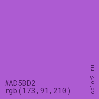 Цвет #AD5BD2 в цветовой модели RGB обозначается тремя октетами (173, 91, 210) в десятичном формате и #AD5BD2 в шестнадцатиричном (hex) формате, которые являются интенсивностью красного 173 (hex AD), интенсивность зелёного 91 (hex 5B) и интенсивность синего 210 (hex D2).