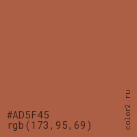 Цвет #AD5F45 в цветовой модели RGB обозначается тремя октетами (173, 95, 69) в десятичном формате и #AD5F45 в шестнадцатиричном (hex) формате, которые являются интенсивностью красного 173 (hex AD), интенсивность зелёного 95 (hex 5F) и интенсивность синего 69 (hex 45).