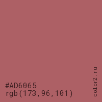 Цвет #AD6065 в цветовой модели RGB обозначается тремя октетами (173, 96, 101) в десятичном формате и #AD6065 в шестнадцатиричном (hex) формате, которые являются интенсивностью красного 173 (hex AD), интенсивность зелёного 96 (hex 60) и интенсивность синего 101 (hex 65).