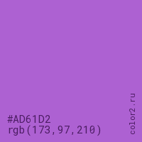 Цвет #AD61D2 в цветовой модели RGB обозначается тремя октетами (173, 97, 210) в десятичном формате и #AD61D2 в шестнадцатиричном (hex) формате, которые являются интенсивностью красного 173 (hex AD), интенсивность зелёного 97 (hex 61) и интенсивность синего 210 (hex D2).