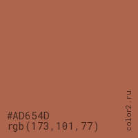 Цвет #AD654D в цветовой модели RGB обозначается тремя октетами (173, 101, 77) в десятичном формате и #AD654D в шестнадцатиричном (hex) формате, которые являются интенсивностью красного 173 (hex AD), интенсивность зелёного 101 (hex 65) и интенсивность синего 77 (hex 4D).