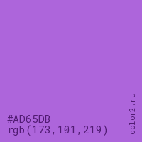 Цвет #AD65DB в цветовой модели RGB обозначается тремя октетами (173, 101, 219) в десятичном формате и #AD65DB в шестнадцатиричном (hex) формате, которые являются интенсивностью красного 173 (hex AD), интенсивность зелёного 101 (hex 65) и интенсивность синего 219 (hex DB).