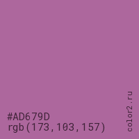 Цвет #AD679D в цветовой модели RGB обозначается тремя октетами (173, 103, 157) в десятичном формате и #AD679D в шестнадцатиричном (hex) формате, которые являются интенсивностью красного 173 (hex AD), интенсивность зелёного 103 (hex 67) и интенсивность синего 157 (hex 9D).