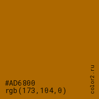 Цвет #AD6800 в цветовой модели RGB обозначается тремя октетами (173, 104, 0) в десятичном формате и #AD6800 в шестнадцатиричном (hex) формате, которые являются интенсивностью красного 173 (hex AD), интенсивность зелёного 104 (hex 68) и интенсивность синего 0 (hex 00).