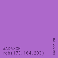 Цвет #AD68CB в цветовой модели RGB обозначается тремя октетами (173, 104, 203) в десятичном формате и #AD68CB в шестнадцатиричном (hex) формате, которые являются интенсивностью красного 173 (hex AD), интенсивность зелёного 104 (hex 68) и интенсивность синего 203 (hex CB).