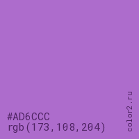 Цвет #AD6CCC в цветовой модели RGB обозначается тремя октетами (173, 108, 204) в десятичном формате и #AD6CCC в шестнадцатиричном (hex) формате, которые являются интенсивностью красного 173 (hex AD), интенсивность зелёного 108 (hex 6C) и интенсивность синего 204 (hex CC).