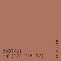 Цвет #AD7461 в цветовой модели RGB обозначается тремя октетами (173, 116, 97) в десятичном формате и #AD7461 в шестнадцатиричном (hex) формате, которые являются интенсивностью красного 173 (hex AD), интенсивность зелёного 116 (hex 74) и интенсивность синего 97 (hex 61).