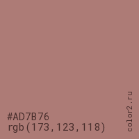 Цвет #AD7B76 в цветовой модели RGB обозначается тремя октетами (173, 123, 118) в десятичном формате и #AD7B76 в шестнадцатиричном (hex) формате, которые являются интенсивностью красного 173 (hex AD), интенсивность зелёного 123 (hex 7B) и интенсивность синего 118 (hex 76).