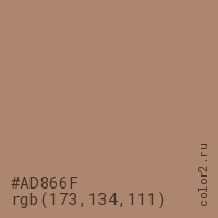 Цвет #AD866F в цветовой модели RGB обозначается тремя октетами (173, 134, 111) в десятичном формате и #AD866F в шестнадцатиричном (hex) формате, которые являются интенсивностью красного 173 (hex AD), интенсивность зелёного 134 (hex 86) и интенсивность синего 111 (hex 6F).