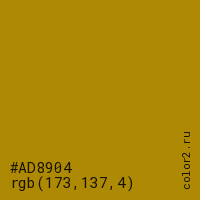 Цвет #AD8904 в цветовой модели RGB обозначается тремя октетами (173, 137, 4) в десятичном формате и #AD8904 в шестнадцатиричном (hex) формате, которые являются интенсивностью красного 173 (hex AD), интенсивность зелёного 137 (hex 89) и интенсивность синего 4 (hex 04).