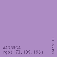 Цвет #AD8BC4 в цветовой модели RGB обозначается тремя октетами (173, 139, 196) в десятичном формате и #AD8BC4 в шестнадцатиричном (hex) формате, которые являются интенсивностью красного 173 (hex AD), интенсивность зелёного 139 (hex 8B) и интенсивность синего 196 (hex C4).