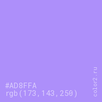 Цвет #AD8FFA в цветовой модели RGB обозначается тремя октетами (173, 143, 250) в десятичном формате и #AD8FFA в шестнадцатиричном (hex) формате, которые являются интенсивностью красного 173 (hex AD), интенсивность зелёного 143 (hex 8F) и интенсивность синего 250 (hex FA).