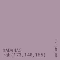 Цвет #AD94A5 в цветовой модели RGB обозначается тремя октетами (173, 148, 165) в десятичном формате и #AD94A5 в шестнадцатиричном (hex) формате, которые являются интенсивностью красного 173 (hex AD), интенсивность зелёного 148 (hex 94) и интенсивность синего 165 (hex A5).