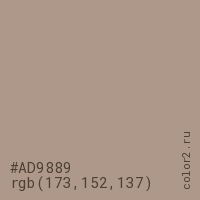 Цвет #AD9889 в цветовой модели RGB обозначается тремя октетами (173, 152, 137) в десятичном формате и #AD9889 в шестнадцатиричном (hex) формате, которые являются интенсивностью красного 173 (hex AD), интенсивность зелёного 152 (hex 98) и интенсивность синего 137 (hex 89).