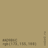 Цвет #AD9B6C в цветовой модели RGB обозначается тремя октетами (173, 155, 108) в десятичном формате и #AD9B6C в шестнадцатиричном (hex) формате, которые являются интенсивностью красного 173 (hex AD), интенсивность зелёного 155 (hex 9B) и интенсивность синего 108 (hex 6C).