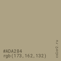 Цвет #ADA284 в цветовой модели RGB обозначается тремя октетами (173, 162, 132) в десятичном формате и #ADA284 в шестнадцатиричном (hex) формате, которые являются интенсивностью красного 173 (hex AD), интенсивность зелёного 162 (hex A2) и интенсивность синего 132 (hex 84).