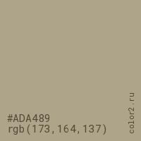 Цвет #ADA489 в цветовой модели RGB обозначается тремя октетами (173, 164, 137) в десятичном формате и #ADA489 в шестнадцатиричном (hex) формате, которые являются интенсивностью красного 173 (hex AD), интенсивность зелёного 164 (hex A4) и интенсивность синего 137 (hex 89).