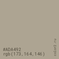 Цвет #ADA492 в цветовой модели RGB обозначается тремя октетами (173, 164, 146) в десятичном формате и #ADA492 в шестнадцатиричном (hex) формате, которые являются интенсивностью красного 173 (hex AD), интенсивность зелёного 164 (hex A4) и интенсивность синего 146 (hex 92).