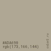 Цвет #ADA690 в цветовой модели RGB обозначается тремя октетами (173, 166, 144) в десятичном формате и #ADA690 в шестнадцатиричном (hex) формате, которые являются интенсивностью красного 173 (hex AD), интенсивность зелёного 166 (hex A6) и интенсивность синего 144 (hex 90).