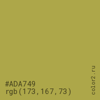 Цвет #ADA749 в цветовой модели RGB обозначается тремя октетами (173, 167, 73) в десятичном формате и #ADA749 в шестнадцатиричном (hex) формате, которые являются интенсивностью красного 173 (hex AD), интенсивность зелёного 167 (hex A7) и интенсивность синего 73 (hex 49).