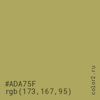 Цвет #ADA75F в цветовой модели RGB обозначается тремя октетами (173, 167, 95) в десятичном формате и #ADA75F в шестнадцатиричном (hex) формате, которые являются интенсивностью красного 173 (hex AD), интенсивность зелёного 167 (hex A7) и интенсивность синего 95 (hex 5F).