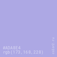 Цвет #ADA8E4 в цветовой модели RGB обозначается тремя октетами (173, 168, 228) в десятичном формате и #ADA8E4 в шестнадцатиричном (hex) формате, которые являются интенсивностью красного 173 (hex AD), интенсивность зелёного 168 (hex A8) и интенсивность синего 228 (hex E4).
