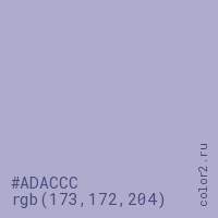 Цвет #ADACCC в цветовой модели RGB обозначается тремя октетами (173, 172, 204) в десятичном формате и #ADACCC в шестнадцатиричном (hex) формате, которые являются интенсивностью красного 173 (hex AD), интенсивность зелёного 172 (hex AC) и интенсивность синего 204 (hex CC).