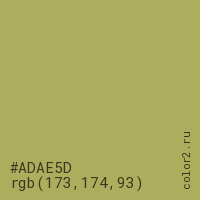 Цвет #ADAE5D в цветовой модели RGB обозначается тремя октетами (173, 174, 93) в десятичном формате и #ADAE5D в шестнадцатиричном (hex) формате, которые являются интенсивностью красного 173 (hex AD), интенсивность зелёного 174 (hex AE) и интенсивность синего 93 (hex 5D).