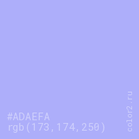 Цвет #ADAEFA в цветовой модели RGB обозначается тремя октетами (173, 174, 250) в десятичном формате и #ADAEFA в шестнадцатиричном (hex) формате, которые являются интенсивностью красного 173 (hex AD), интенсивность зелёного 174 (hex AE) и интенсивность синего 250 (hex FA).