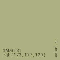 Цвет #ADB181 в цветовой модели RGB обозначается тремя октетами (173, 177, 129) в десятичном формате и #ADB181 в шестнадцатиричном (hex) формате, которые являются интенсивностью красного 173 (hex AD), интенсивность зелёного 177 (hex B1) и интенсивность синего 129 (hex 81).