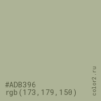 Цвет #ADB396 в цветовой модели RGB обозначается тремя октетами (173, 179, 150) в десятичном формате и #ADB396 в шестнадцатиричном (hex) формате, которые являются интенсивностью красного 173 (hex AD), интенсивность зелёного 179 (hex B3) и интенсивность синего 150 (hex 96).