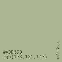 Цвет #ADB593 в цветовой модели RGB обозначается тремя октетами (173, 181, 147) в десятичном формате и #ADB593 в шестнадцатиричном (hex) формате, которые являются интенсивностью красного 173 (hex AD), интенсивность зелёного 181 (hex B5) и интенсивность синего 147 (hex 93).
