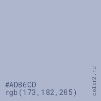 Цвет #ADB6CD в цветовой модели RGB обозначается тремя октетами (173, 182, 205) в десятичном формате и #ADB6CD в шестнадцатиричном (hex) формате, которые являются интенсивностью красного 173 (hex AD), интенсивность зелёного 182 (hex B6) и интенсивность синего 205 (hex CD).