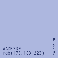 Цвет #ADB7DF в цветовой модели RGB обозначается тремя октетами (173, 183, 223) в десятичном формате и #ADB7DF в шестнадцатиричном (hex) формате, которые являются интенсивностью красного 173 (hex AD), интенсивность зелёного 183 (hex B7) и интенсивность синего 223 (hex DF).