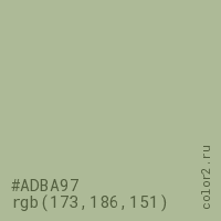 Цвет #ADBA97 в цветовой модели RGB обозначается тремя октетами (173, 186, 151) в десятичном формате и #ADBA97 в шестнадцатиричном (hex) формате, которые являются интенсивностью красного 173 (hex AD), интенсивность зелёного 186 (hex BA) и интенсивность синего 151 (hex 97).