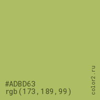 Цвет #ADBD63 в цветовой модели RGB обозначается тремя октетами (173, 189, 99) в десятичном формате и #ADBD63 в шестнадцатиричном (hex) формате, которые являются интенсивностью красного 173 (hex AD), интенсивность зелёного 189 (hex BD) и интенсивность синего 99 (hex 63).